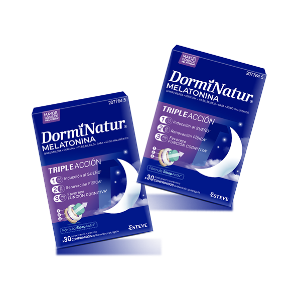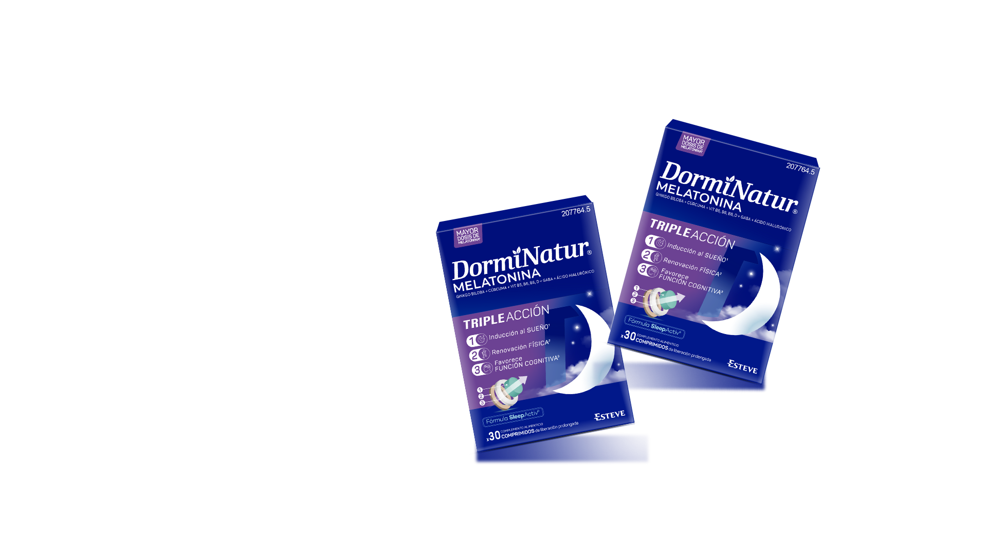 DormiNatur® Triple Acción es un complemento alimenticio formulado para ayudar a conciliar el sueño y favorecer la renovación física y mental durante éste, contribuyendo a mejorar la función cognitiva.